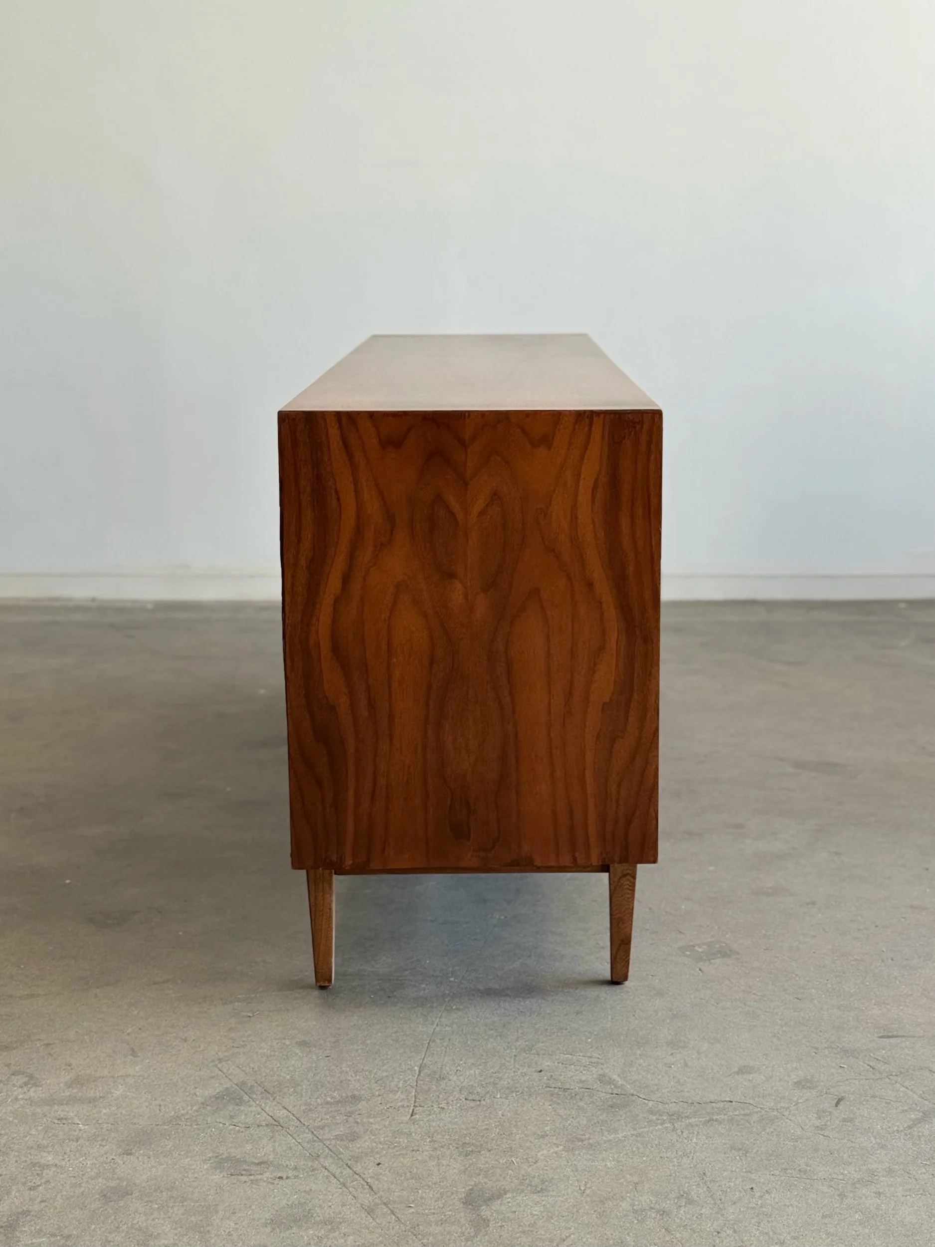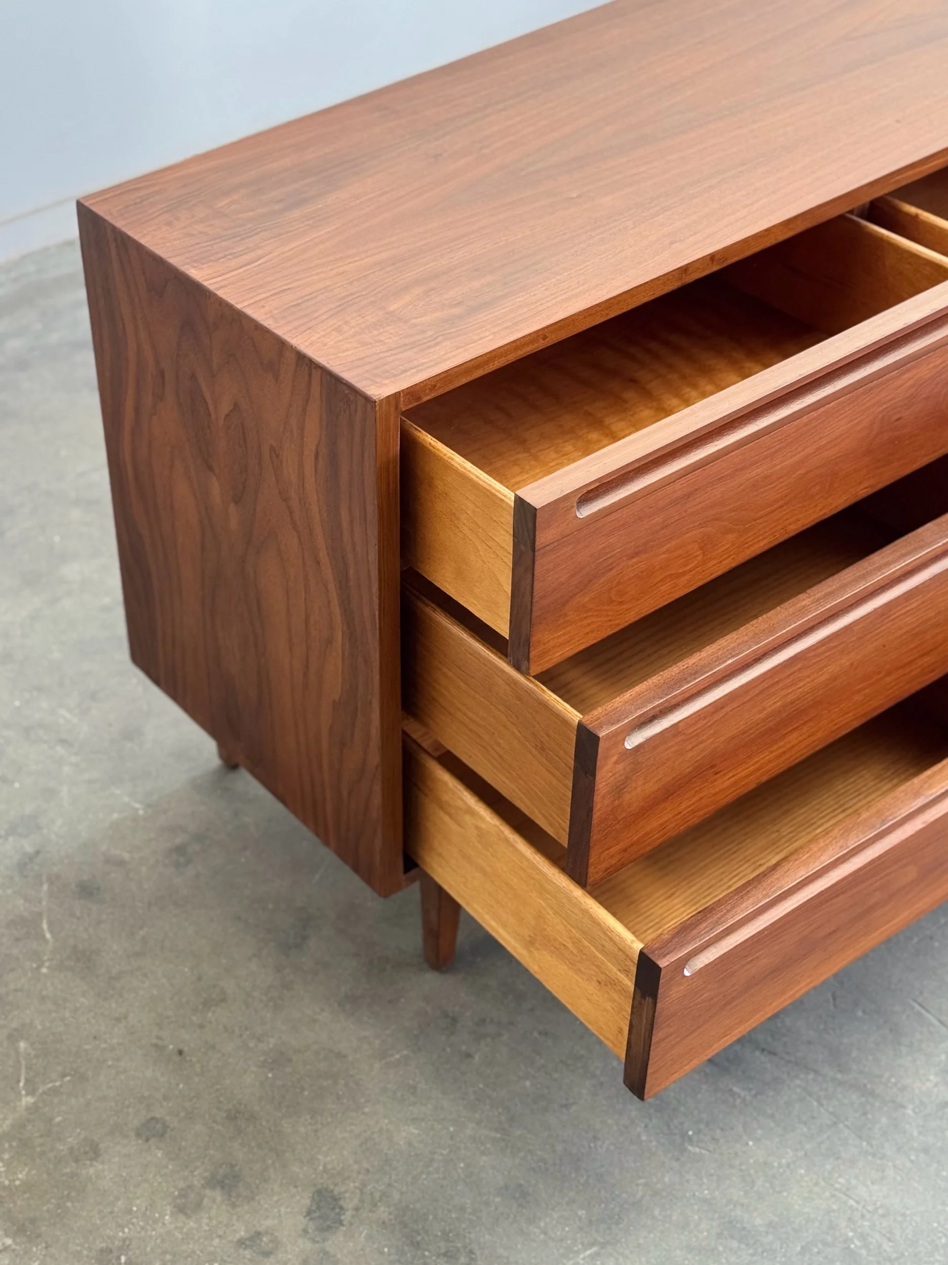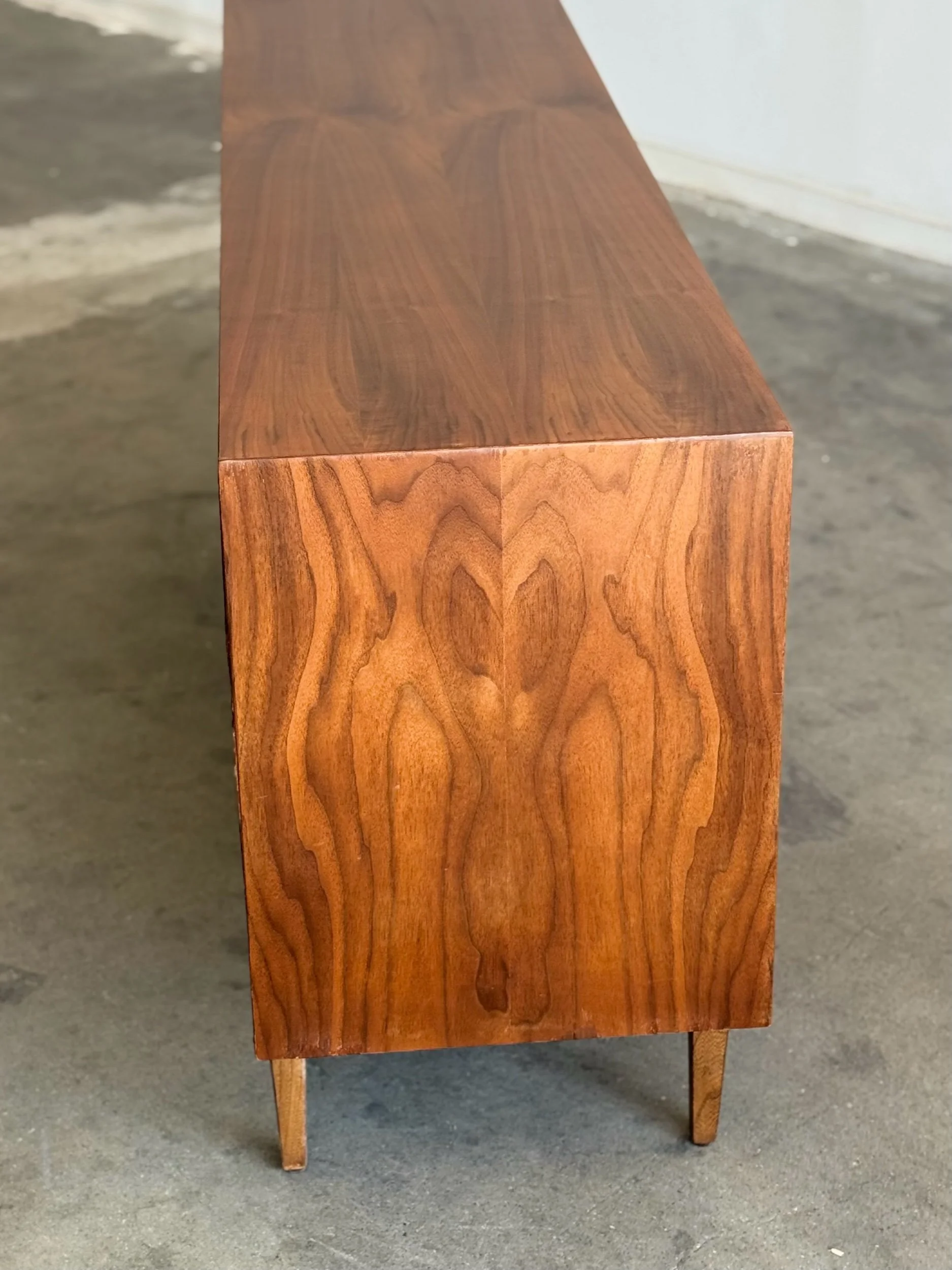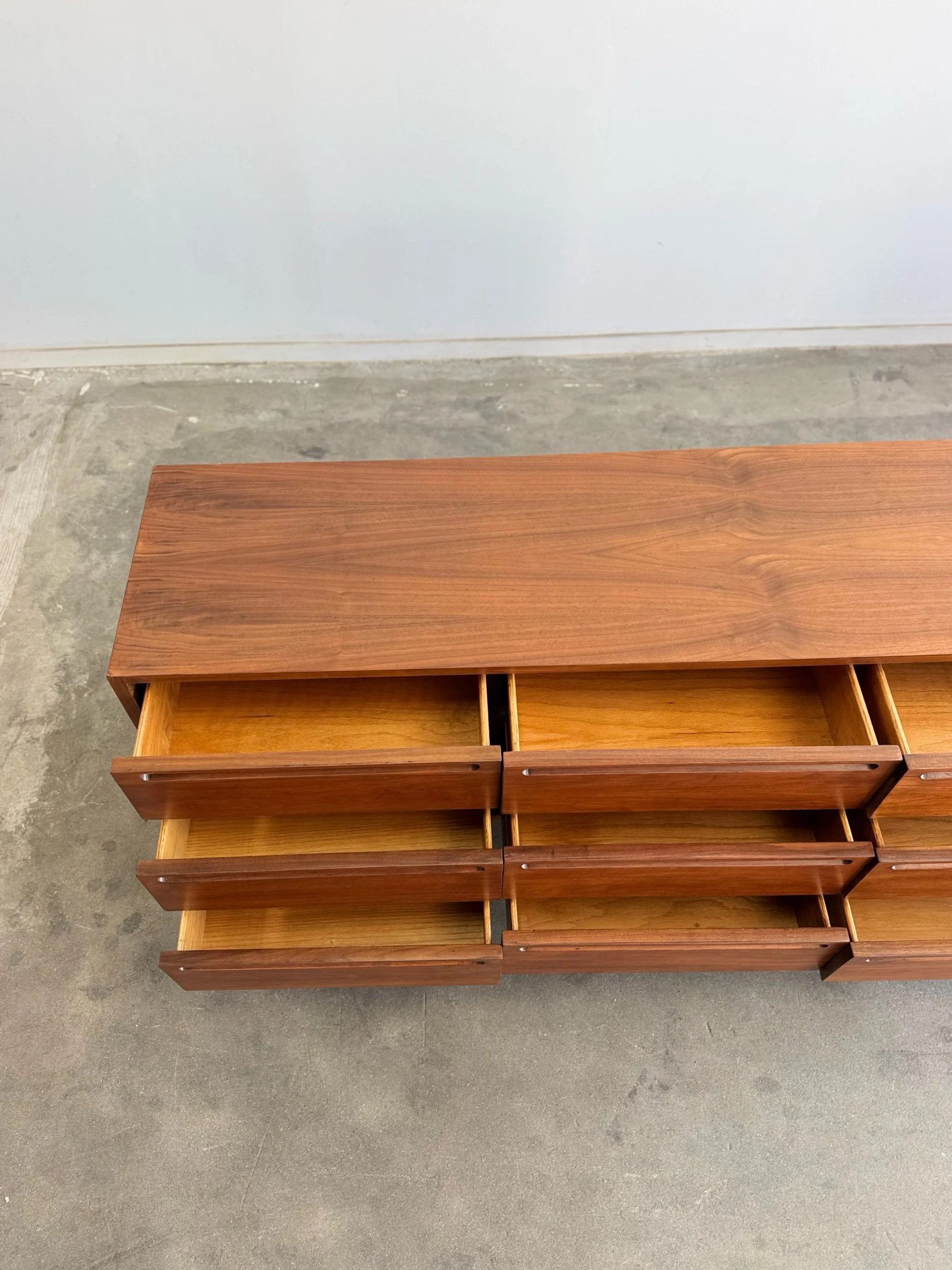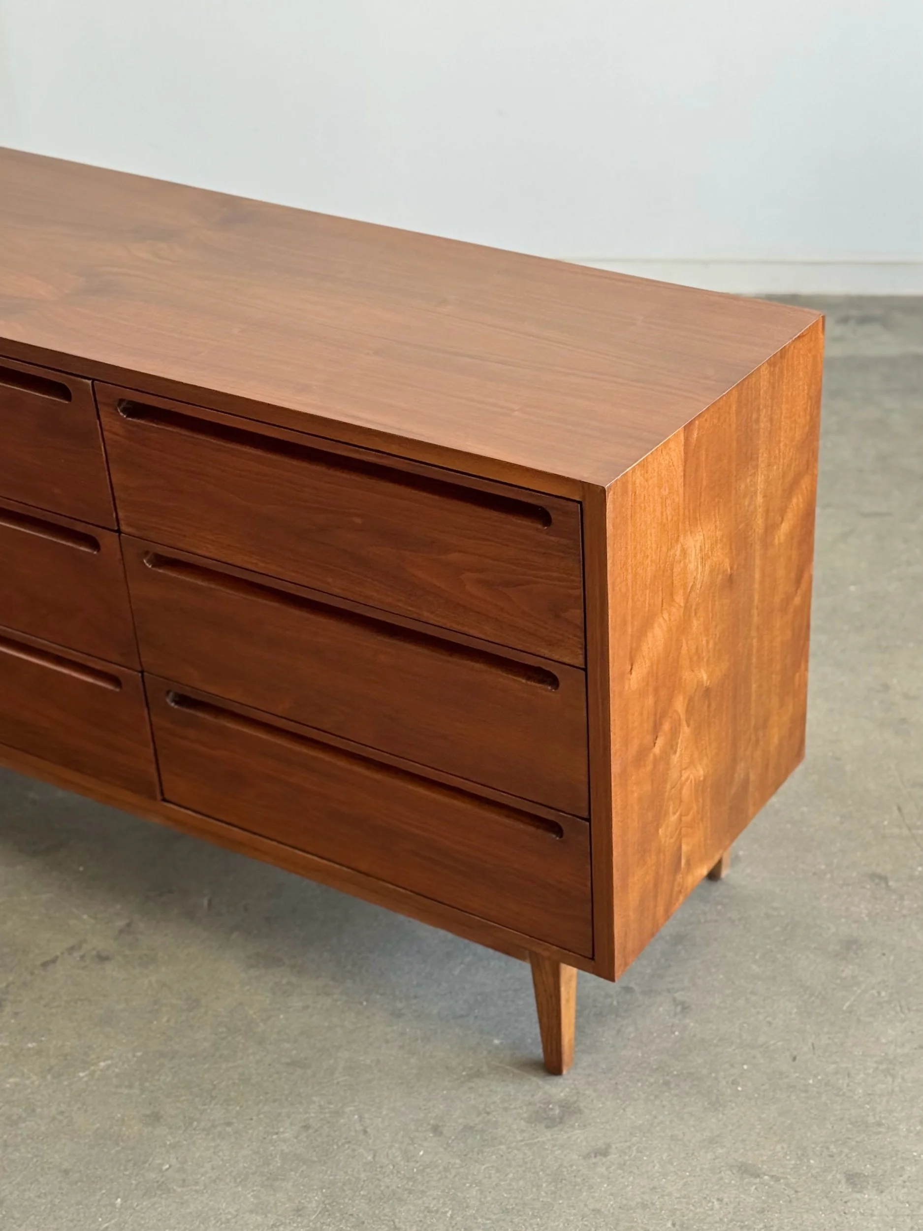 Large dresser in fully restored condition by American of Martinsville. Item is structurally sound and fully functional. Unit has original hardware and sits on solid tapered legs . Unit has drawer stoppers added to keep drawers secured , drawers can still be removed when needed.