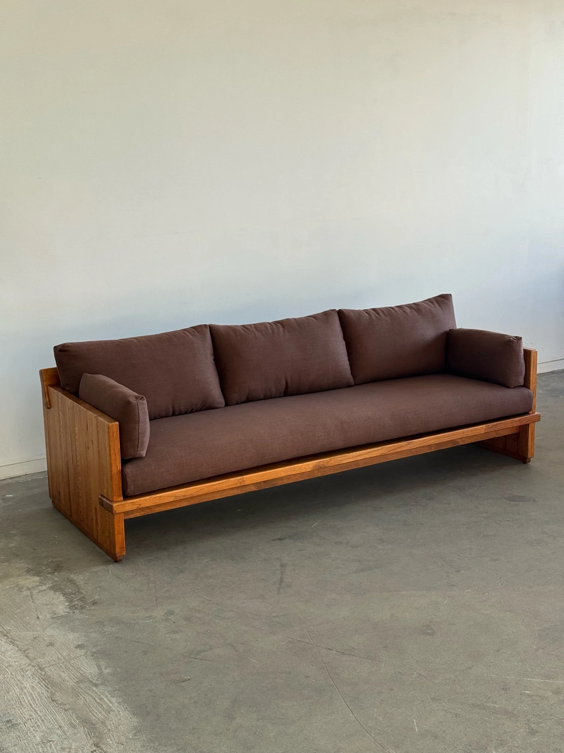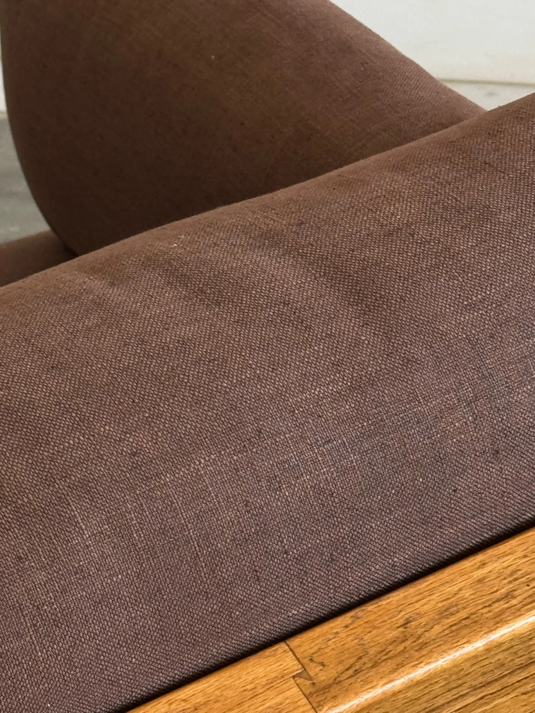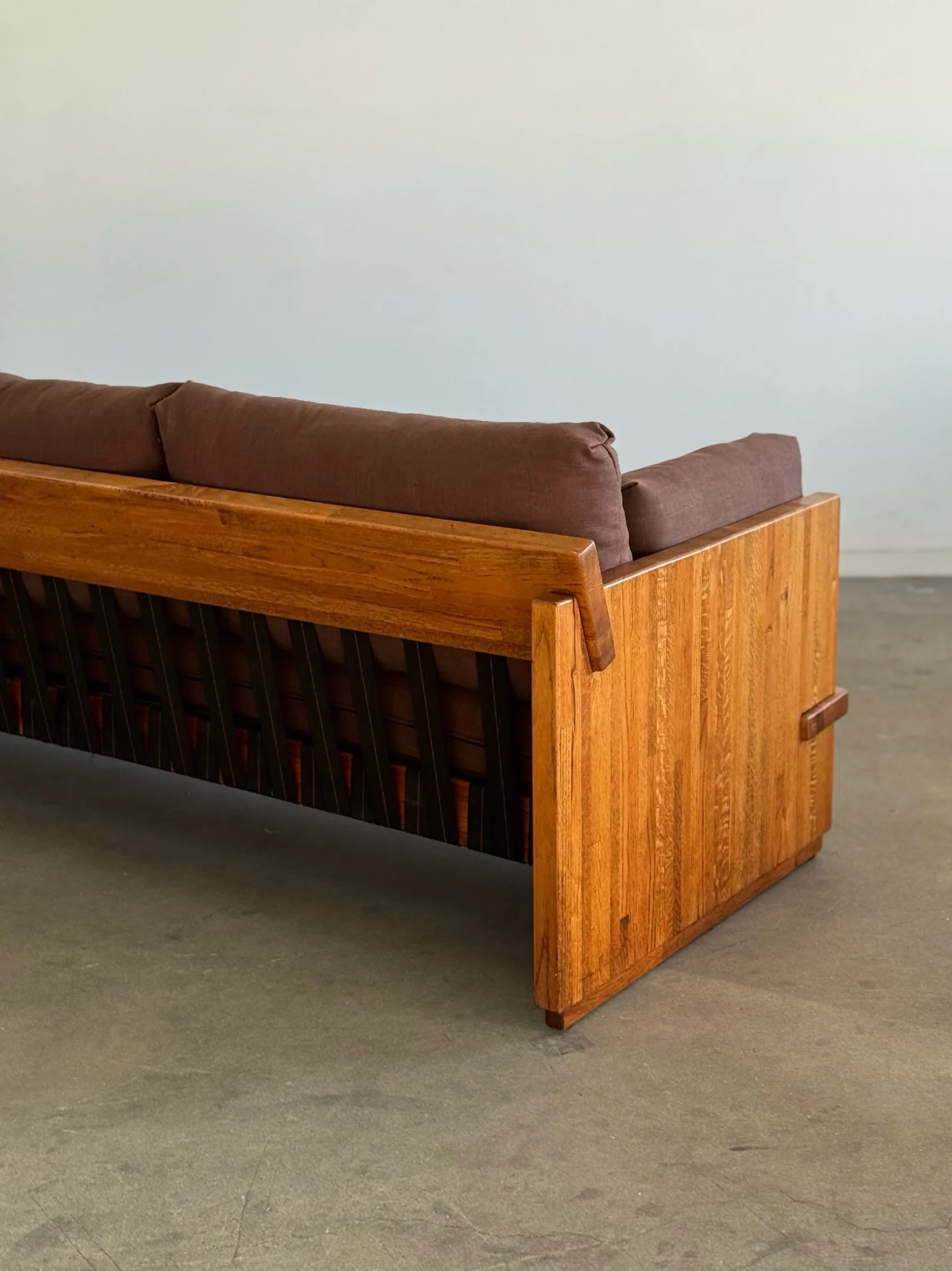 Oak sling sofa in good vintage condition. Item has new foam , new straps , and linen upholstery. Sofa frame has been structurally restored and refinished. Unit shows in great condition.