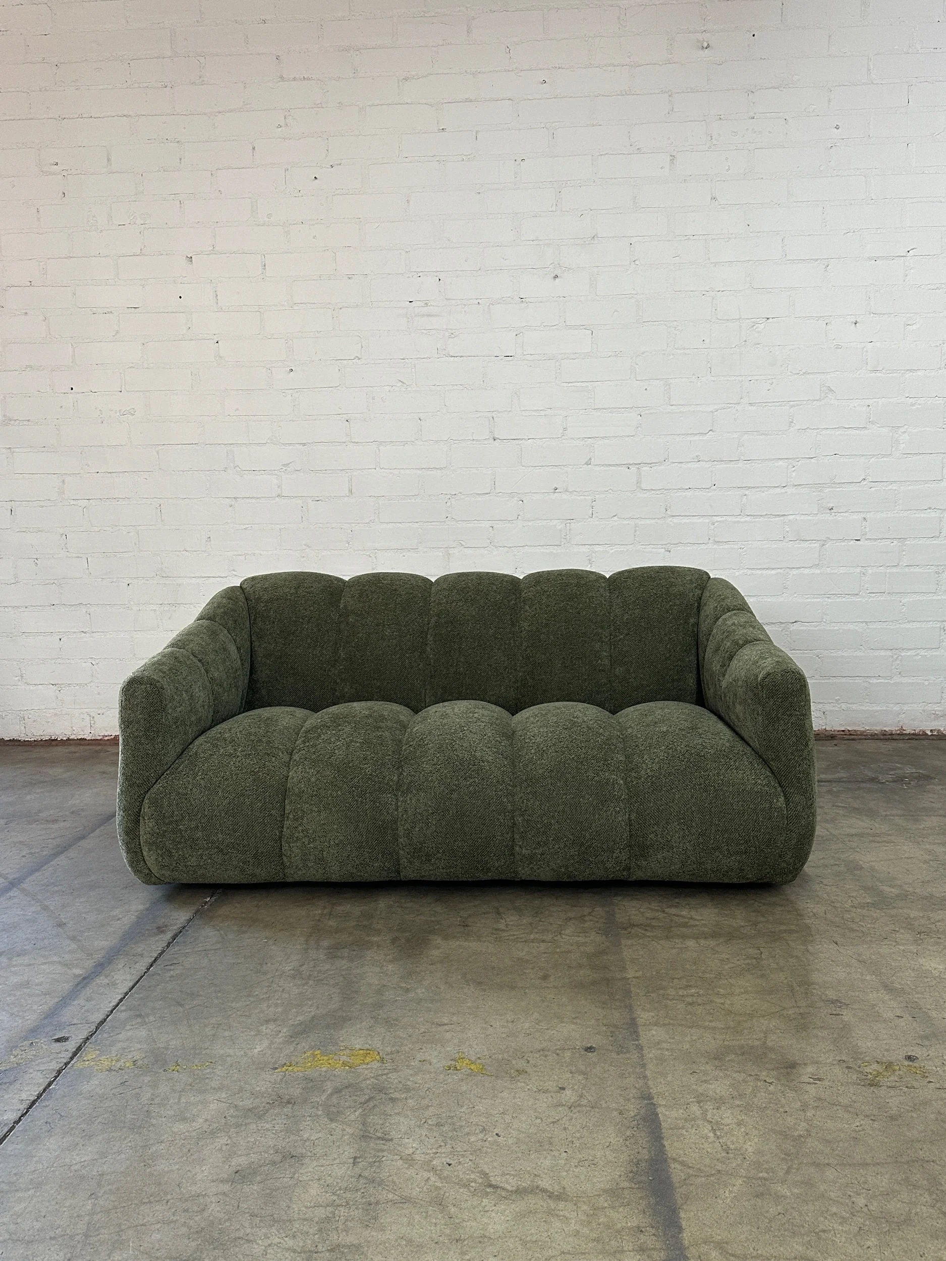 Handcrafted loveseat version of our channel sofa made from scratch in house. Loveseat features hand tied springs, feather and foam for great comfort. Item has a green nubby boucle and sits on low profile legs.
