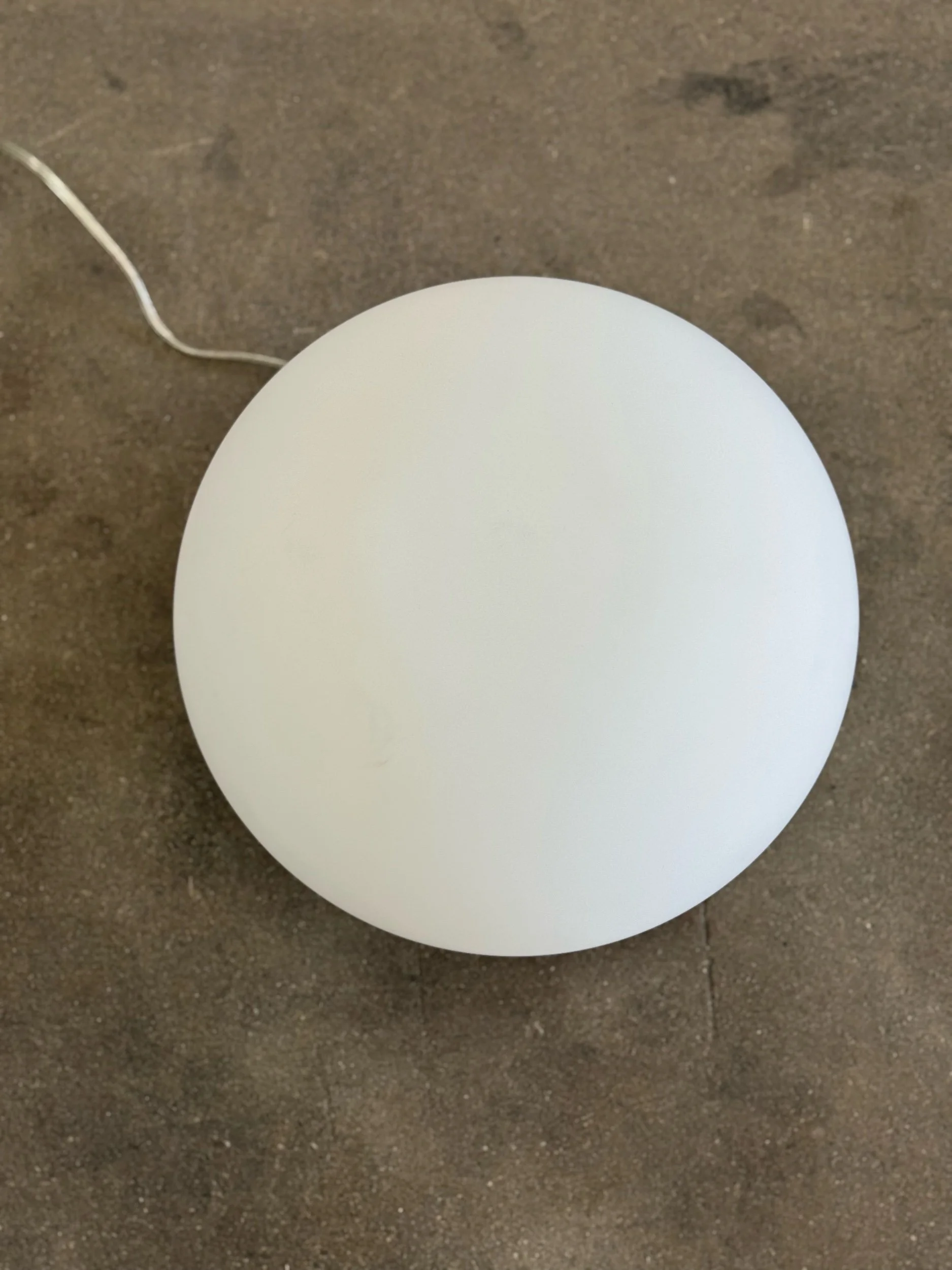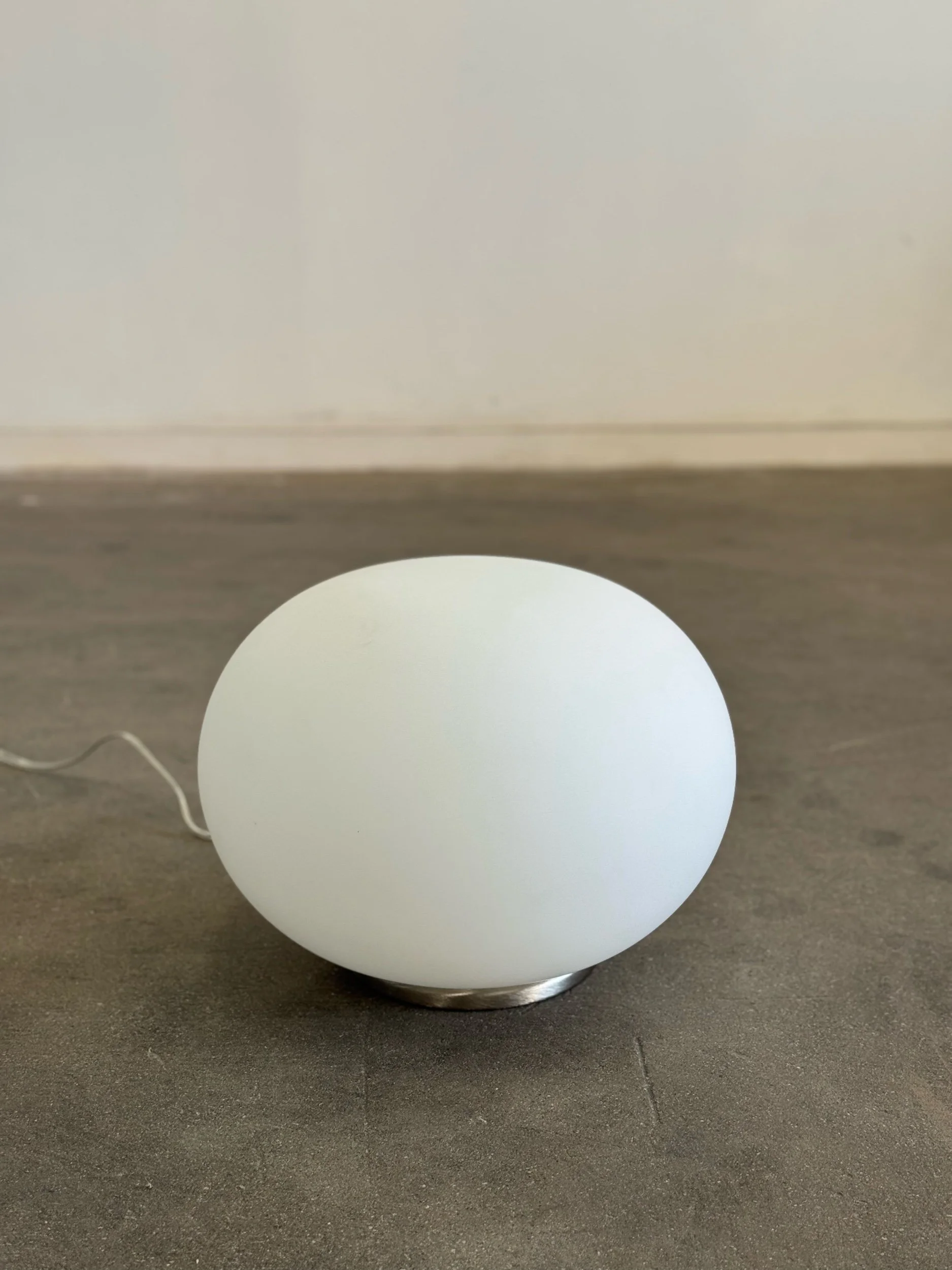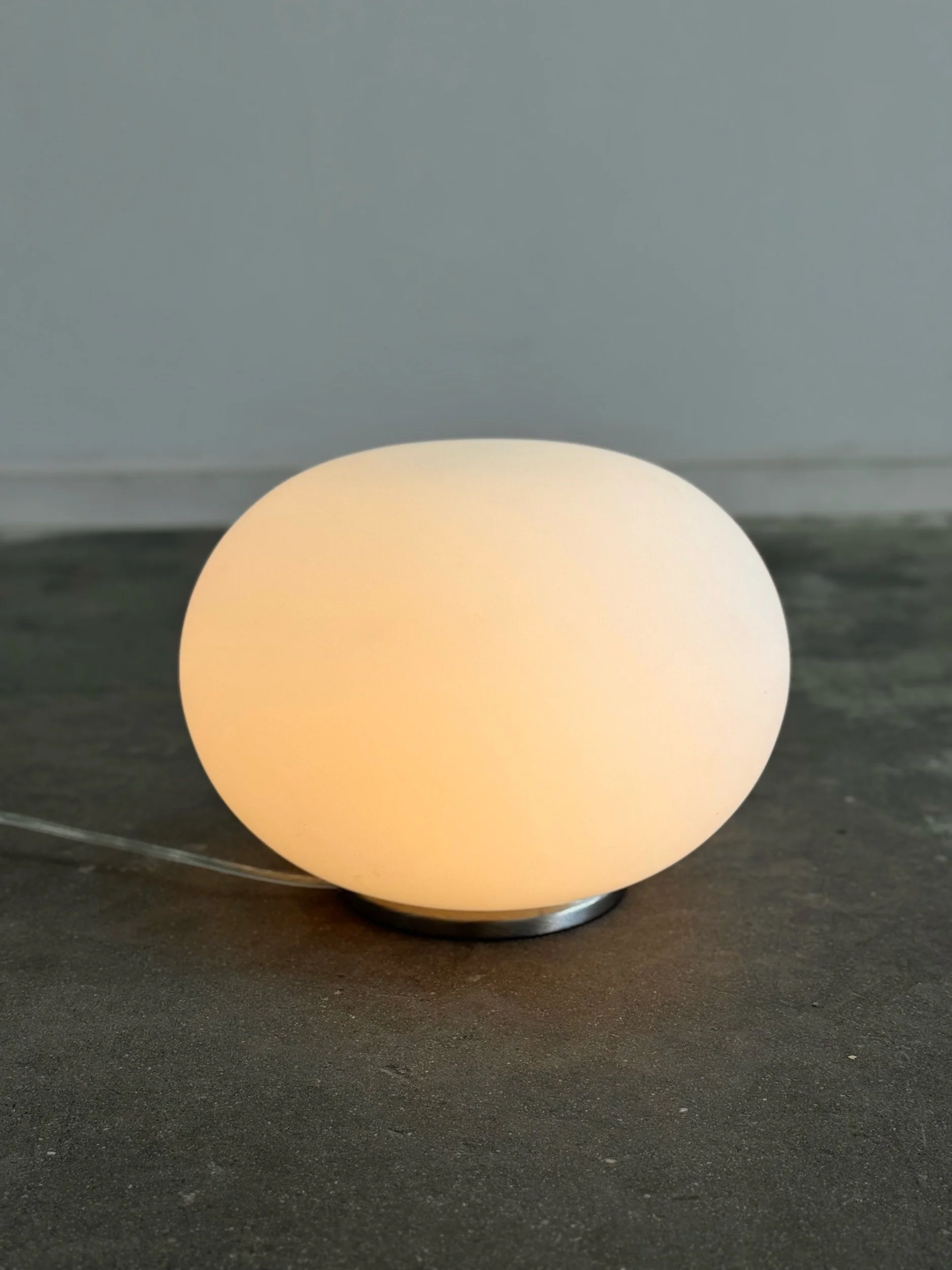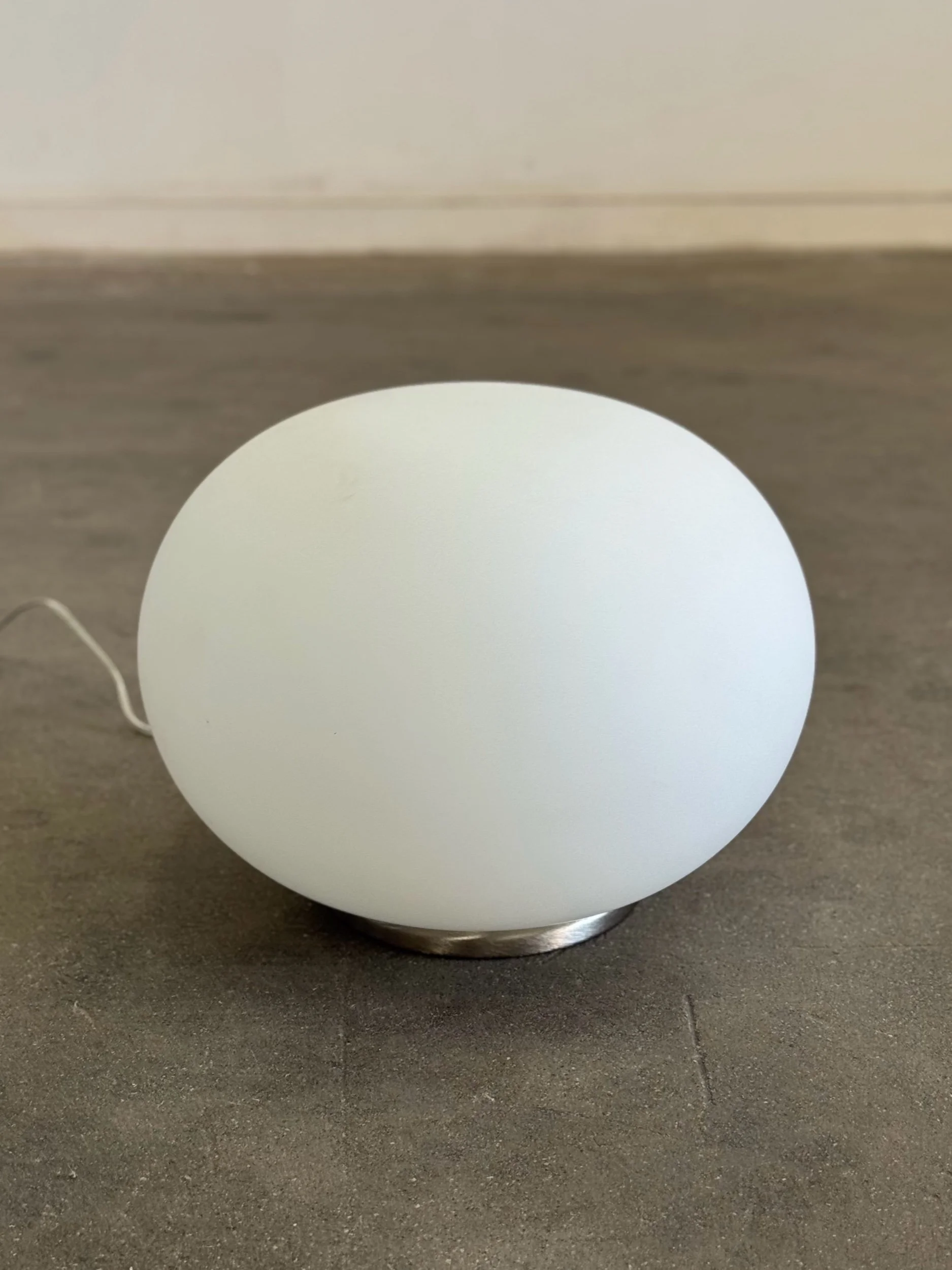 A sculptural orb table lamp by La Relco, Italy. This minimalist piece features a frosted glass globe resting on a brushed metal base, producing a warm, ambient glow when illuminated. Perfect as a bedside lamp, accent light, or sculptural object in any contemporary or vintage inspired home.