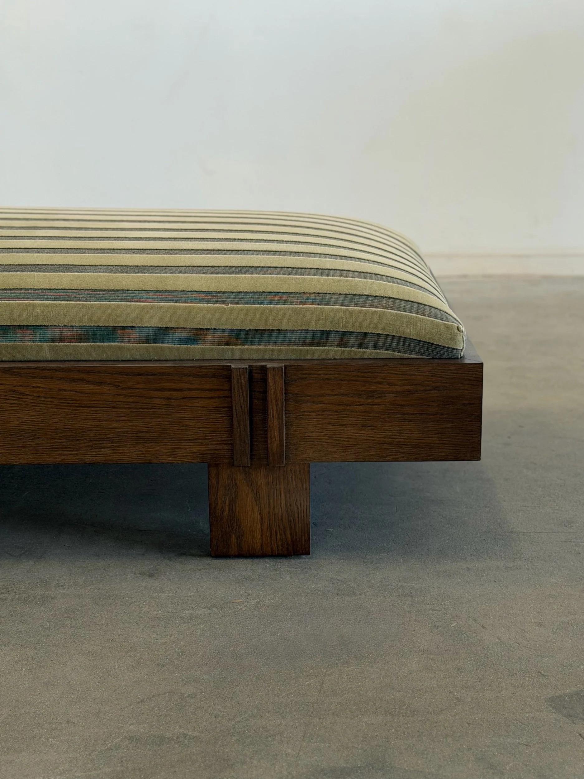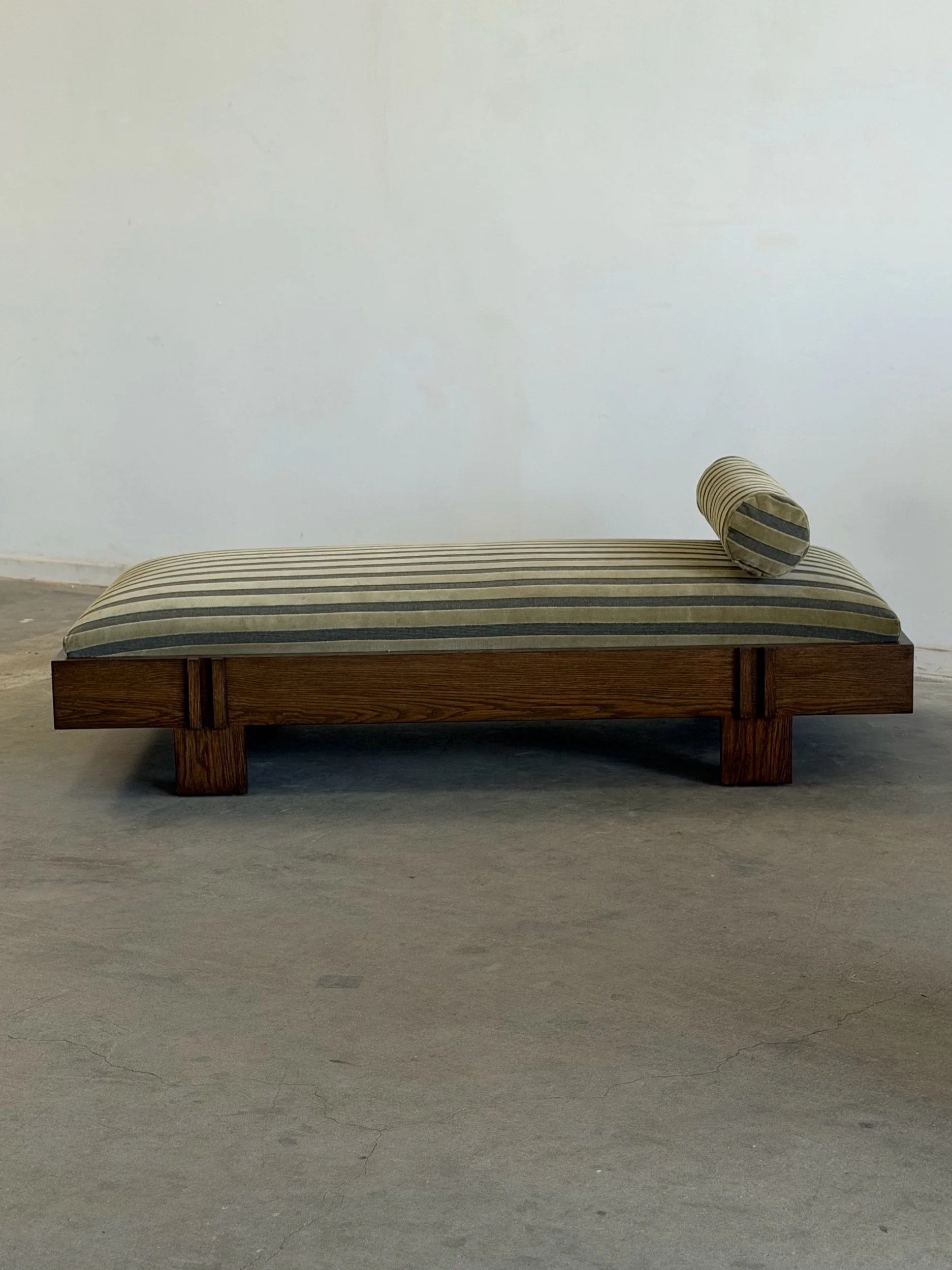 Custom made in house, this limited edition version of one of our made to order models, the Madura Daybed features a curated striped green & black velvet upholstery. The low profile silhouette features a plush seat with a loose bolster pillow filled with vegan feather fill. Crafted from solid oak and finished in ebony, this base balances clean lines with subtle detailing that gives this piece its architectural feel.